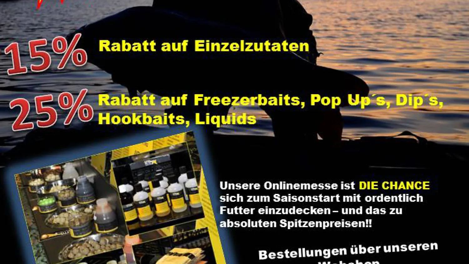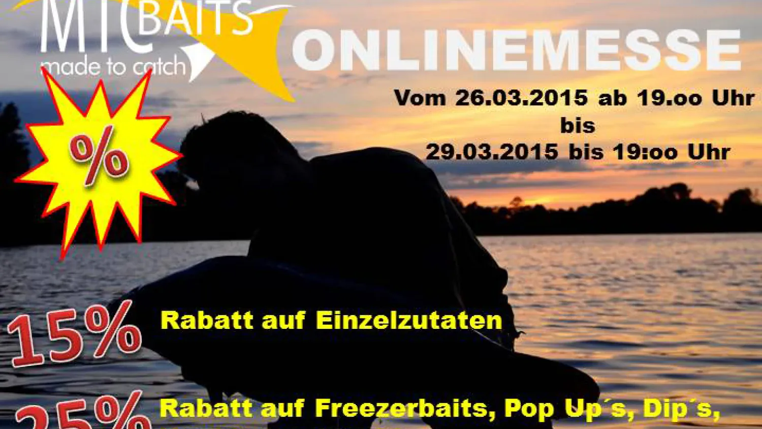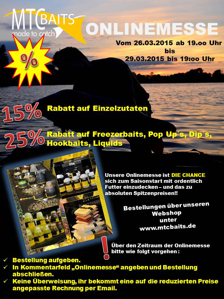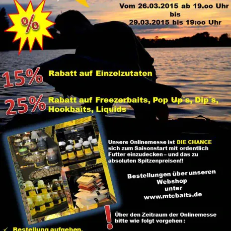 Morgen, am Donnerstag, den 26.03.2015 beginnt die große Online-Messe bei MTC Baits. Der niederländische Hersteller für Premium Köder gibt während der viertägigen Online-Messe auf alle Freezer Boilies, Poip Up's, Hookbaits, Dip's und Liquids satte 25% Rabatt! Auf Einzelzutaten für die Boilieherstellung erhaltet ihr immerhin 15% Rabatt auf eure Bestellung! Die Rabattierung gilt bis einschließlich Sonntag, den 29.03.2015.