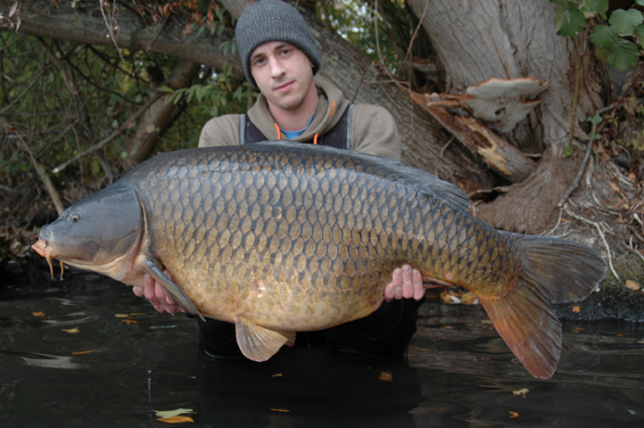 Mein Kumpel Daniel Zoller schloss sich bei dieser Session mir an. Nebel machte es uns schwer die Ruten abzulegen: Es brauchte ein paar Versuche bis alles so lag, wie es sollte. Die Nacht und der Morgen verliefen ohne Aktion, lediglich eine Nutria sorgte für ein paar Pieper, als sie immer wieder durch unsere Schnüre schwamm. Erst gegen 13 Uhr, als der Nebel sich verzogen hatte, lief die Rute auf dem Plateau ab. Erneut ein Schuppi um die 25 Pfund. Solangsam fing ich an mich zu fragen, ob der größere Bartelträger in der Session davor eine Ausnahme bleiben sollte und die Urfische des Gewässers vielleicht doch nicht auf den Platz aufmerksam wurden. Sonst geschah über den Mittag nichts mehr – doch gegen 16:30 Uhr meldete sich Daniels Bissanzeiger. Tatsächlich lief mal eine der tiefer abgelegten Ruten ab und man konnte sich im Drill schon denken, dass es ein guter Fisch sein muss. Ein fetter Schuppi kam an die Oberfläche und der erste Vierziger Fisch lag auf der Matte!