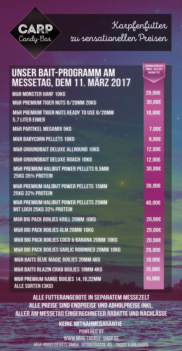 Nach dem großen Erfolg der „Carp Candy Bar“ im vergangenen Jahr, wir für die kommende Messe noch mehr Karpfenfutter zu Kampfpreisen aufgefahren: So kann sich jeder für die bevorstehende Saison mit Tigernüssen, Pellets, Hanf, Partikeln und Boilies eindecken. Von MuR Angelgeräte heißt es dazu: