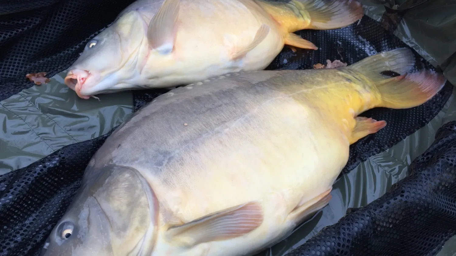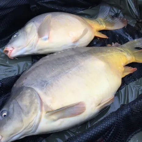 Nachdem ich den Fisch mit knapp 15 Kg im Kescher hatte, schaute ich nach meiner anderen Rute. Der Bissanzeiger war wieder verstummt, da der Fisch wie befürchtet im Totholz fest hing. Nach kurzem warten hatte sich der Gute jedoch selbst befreit und ich konnte einen kleinen dicken Spiegler mit knapp 7 Kg auf der Matte begrüßen! Drei Fische nach gut 30 Minuten! Was ist denn da heute los?