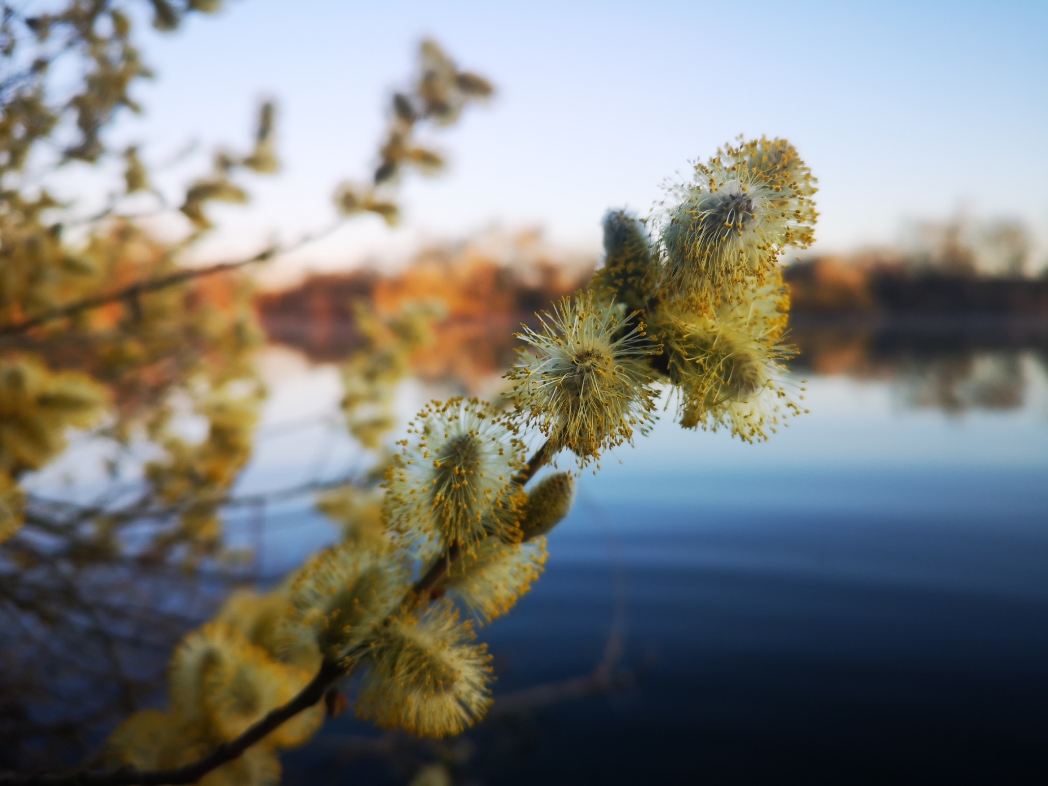 Ganz vorsichtig legte ich meinen kleinen 15mm Sinker auf den kiesigen Untergrund, verteilte zwei Hände voll Boilies und machte mich wieder auf den Rückweg. Auch die andere Rute fand ihren Platz. Die zweite Stelle, die ich vorgefüttert hatte, war eine kleine Landzunge, die sich einige Meter in den See hineinzog und ein klares Highlight in diesem eher Badewanne-gleichen Bereich darstellte. Auch hier verteilte ich einige Boilies und drei Kellen Partikel. Etwa zeitgleich trafen Andreas und ich wieder am Ufer an. Zeit für das wohlverdiente „Feierabendradler“! Wir genossen es, hier zu sein, diese Ruhe um uns herum, diese Freiheit… Unsere Müdigkeit war uns sicher anzusehen, immerhin sind 12h Nachtschicht schon nicht ohne, aber zumindest für meine Wenigkeit war an Schlaf nicht einmal ansatzweise zu denken. Ich war aufgedreht und mir sicher, dass es nicht lange dauern würde, bis meine „Buschrute“ losballern würde. Nach unserem Radler machte es sich Andi in seinem Schlafsack gemütlich. Ich hingegen lief umher, machte Fotos, filmte blühende Weidenkätzchen und die aufgehende Sonne.