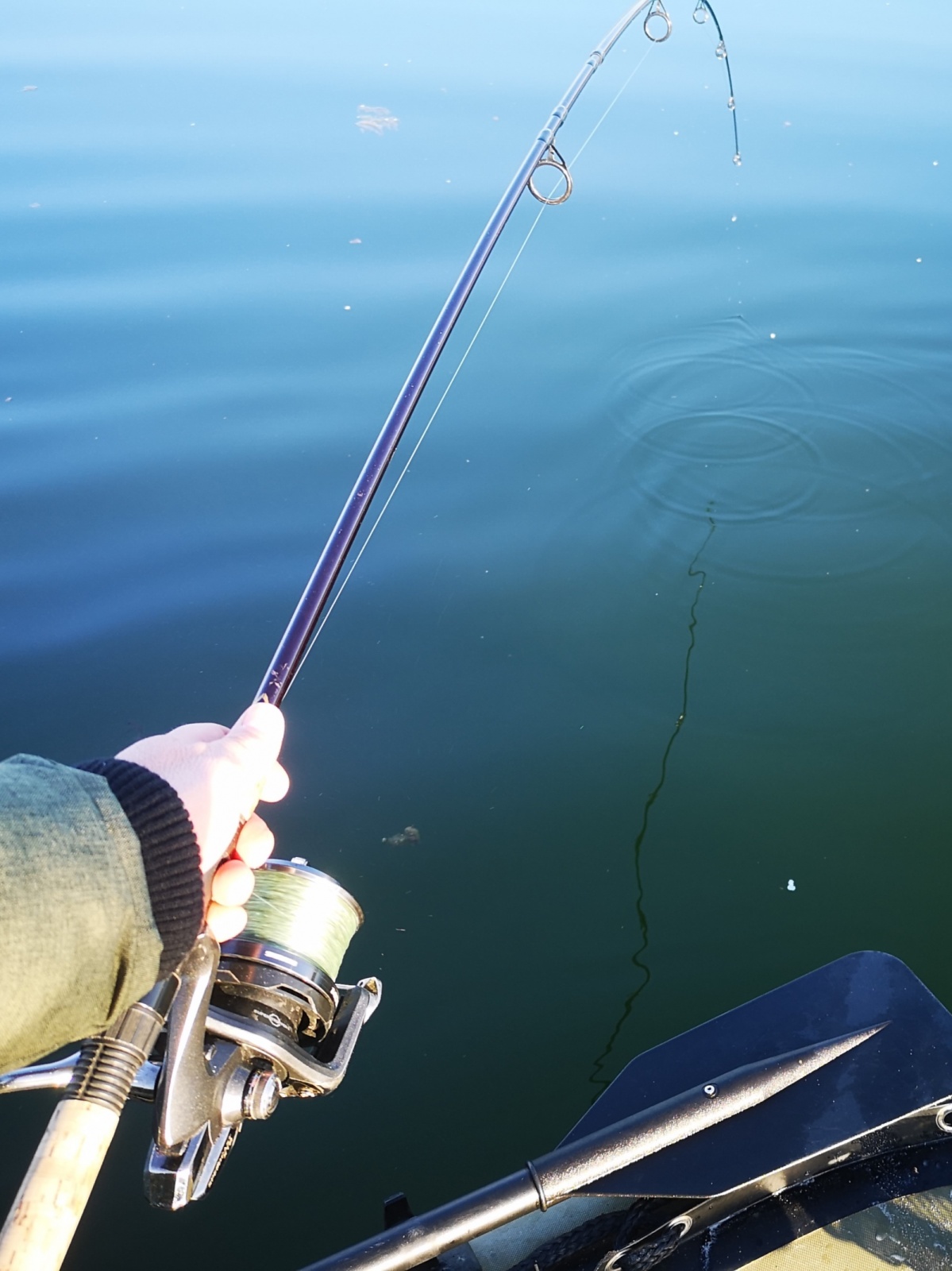In dem Moment, als ich meine Buschrute im Visier und „scharf gestellt“ hatte, dröhnte auch schon mein Siren los. Zu meiner Verwunderung war es die Rute auf der kleinen Landzunge! Der erste Fisch der Session war direkt ein schöner. Lang, volle Power und sogar über 15kg schwer. Ich freute mich riesig. Nach dem ganzen Hin und Her in diesem Frühjahr hatte etwas Geplantes endlich funktioniert und das bereits nach ner halben Stunde am Wasser. Nach dem Ablichten des tollen Tieres ging plötzlich alles Schlag auf Schlag. Noch ehe ich die Rute wieder in Position gebracht hatte, lief auch schon die Buschrute los – und wäre das nicht schon genug, vernahm ich auch Andi im Augenwinkel mit durchgebogener Rute im Boot.