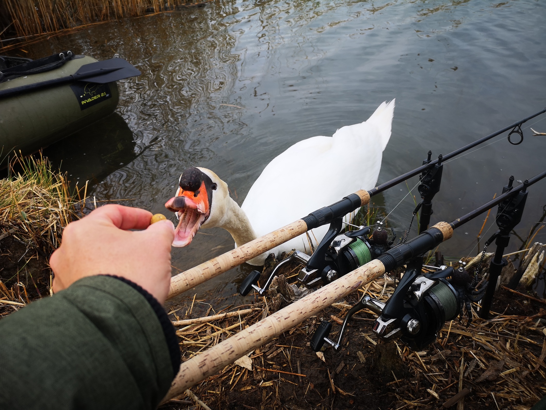 Mit hibbeligen Beinen saßen Andi und ich die letzten Minuten der Nachtschicht in der Messwarte und fieberten Sekunde für Sekunde dem Feierabend entgegen. Wir wollten los, ein Stück Freiheit genießen, leergefegte Futterplätze bestaunen und ein, zwei schöne Fische in den Armen wiegen. Geduscht wurde an diesem Morgen nur ganz schnell; ne Katzenwäsche sozusagen. Auf der Fahrt zum See hatte ich immer wieder die kleine, ufernahe, kahle Stelle im Kopf. Würden die Fische noch da sein? Haben sie das Futter gefressen, oder war es vielleicht ein Tick zu viel für diese Jahreszeit? Oh man, war ich aufgeregt! All die Fragen, all die Selbstzweifel lösten sich allerdings auf, als sich direkt bei unserer Ankunft ein guter Fisch in der Nähe des einen Busches aus dem Wasser schraubte und das spiegelglatte Wasser für einen Moment in Bewegung setzte. Zu halten war ich nun nicht mehr und noch ehe ich mein ganzes Hab und Gut für diese Session aus dem Auto räumte, befand ich mich auch schon mit starrem Blick und gezückter Rute auf meinem Boot. Ganz langsam ruderte ich dem Spot am gegenüberliegenden Ufer entgegen. Kurz bevor ich die Stelle erreichte, stellte ich mich hin und ließ mich die letzten paar Meter gleiten. Auch an diesem Morgen war das Wasser sehr klar. Fische konnte ich zwar keine ausmachen, aber das eingebrachte Futter war zu meiner Freude komplett weggefegt.