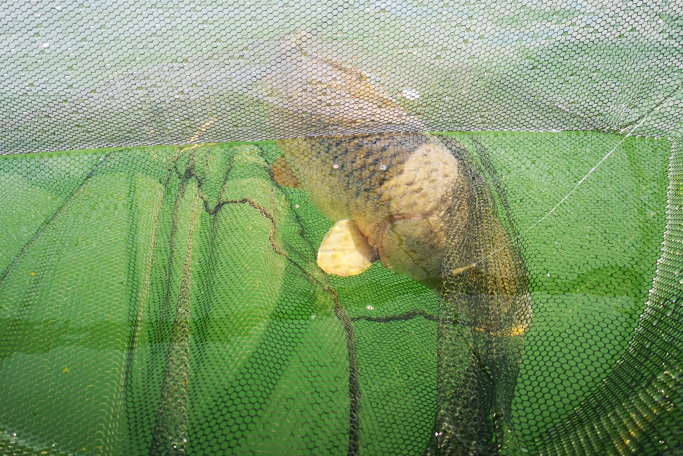 Und dann kam er! Der Fisch, den ich so sehr wollte. Deutlich konnte ich die großen Schuppen auf seiner Flanke erkennen, während er sich Stück für Stück meinen Maiskörnchen näherte. Gaaaaaanz langsam ließ er seinen massigen Körper gen Boden sinken und begann, vereinzelte Körnchen, die etwas tiefer gelandet waren, aufzusaugen. Mein Herz pochte, meine Knie schlotterten, doch die Richtung, die der Fisch einschlug, gefiel mir überhaupt nicht. Statt sich meinem Hakenköder zu nähern, zog er es vor, im tieferen Wasser zu verschwinden. Satz mit X, war wohl nix! Etwas enttäuscht starrte ich auf meine zwei einsamen Maiskörnchen und überlegte, was ich denn jetzt machen sollte… Weiter Stalken? Hoffen, dass er wieder kommen würde? Oder sollte ich endlich meinen Schlaf nachholen? Noch während ich in meinen Gedanken versunken auf das Wasser schaute, tauchte plötzlich wieder der dicke Spiegler auf. Er schwamm hektisch, zielstrebig zurück in Richtung des dichten Buschdschungels zu meiner Rechten. Bei genauerem Hinsehen fiel es mir aber wie Schuppen von den Augen. Der Gute hatte im tieferen Wasser weiter gefressen und hatte nun ein Problem. Er hatte das Rig, das ich vor gut zwei Stunden neben der Wurzel abgelegt hatte, im Maul, hatte meinen einzelnen Sinker eingesogen und versuchte nun, das lästige Ding loszuwerden! War das denn möglich? Wie von der Tarantel gestochen rannte ich los, durch das dichte Geäst, schrie immer wieder: „Andi, Andi, der Spiegler … der Spiegler!!!“, vergebens… Andi war im Wunderland, versunken in Träumen, die ich gerade erlebte! Wie verrückt war das bitte?!? An der Rute angekommen, stellte ich erst einmal fest, dass der Fisch den Weg ins Freiwasser und nicht zurück in das dichte Buschwerk gefunden hatte. Er war frei, ich konnte drillen und hoffte so sehr, dass das alles gut ausgehen würde! Und tatsächlich war das Glück auf meiner Seite, denn nach einigen Minuten schlossen sich die Maschen meines Keschers um dieses wunderbare Tier und machten mich für einen Moment zum glücklichsten Menschen auf Erden. Wie geil, wie unfassbar geil war dieses Erlebnis schon wieder?! Mehr oder minder hatte ich dieses ganze Szenario auch noch auf Cam festgehalten, besser ging es eigentlich gar nicht! Andi schüttelte nur den Kopf, meinte aber, dass er von mir nix anderes erwartet hätte – verrückt wie ich nun einmal bin.