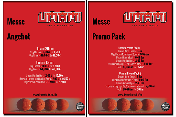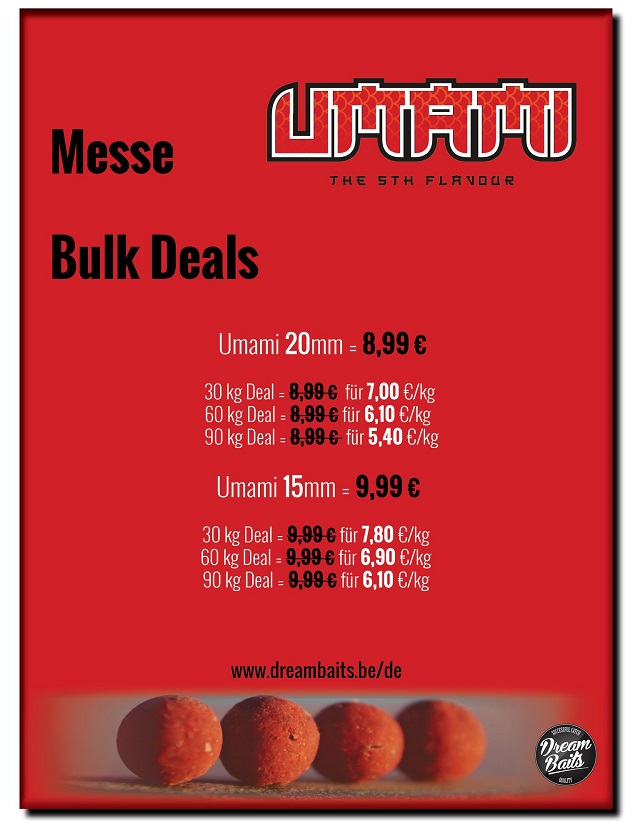 Zusätzlich zu den „Umami“ Angeboten gibt euch Dreambaits auf den Messen 15% Rabatt auf das komplette Sortiment!