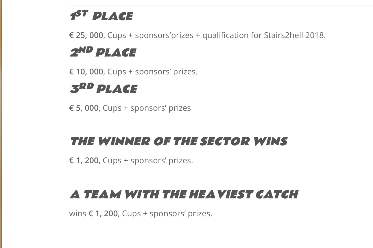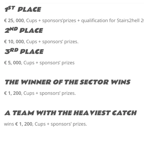 Doch nicht nur bei den üppigen Preisen unterscheidet sich Stairs2Hell von vielen anderen Karpfen Enduros, sondern auch beim Reglement. Bei Stairs2Hell gewinnt nicht das Team mit dem höchsten, gefangenen Gesamtgewicht, sondern das Team, das die drei größten Karpfen fängt! Es bleibt also definitiv bis zum Schluss spannend!