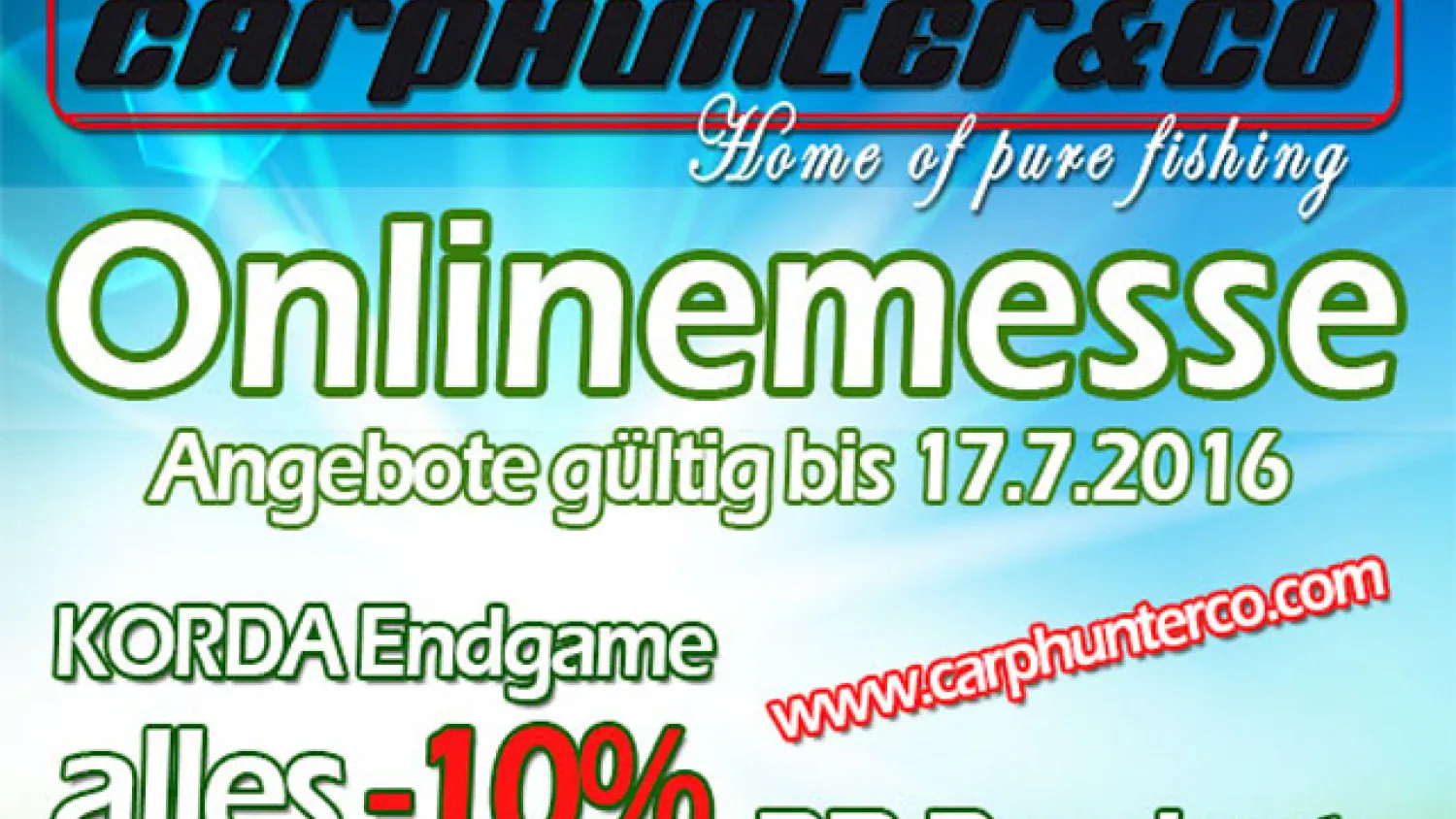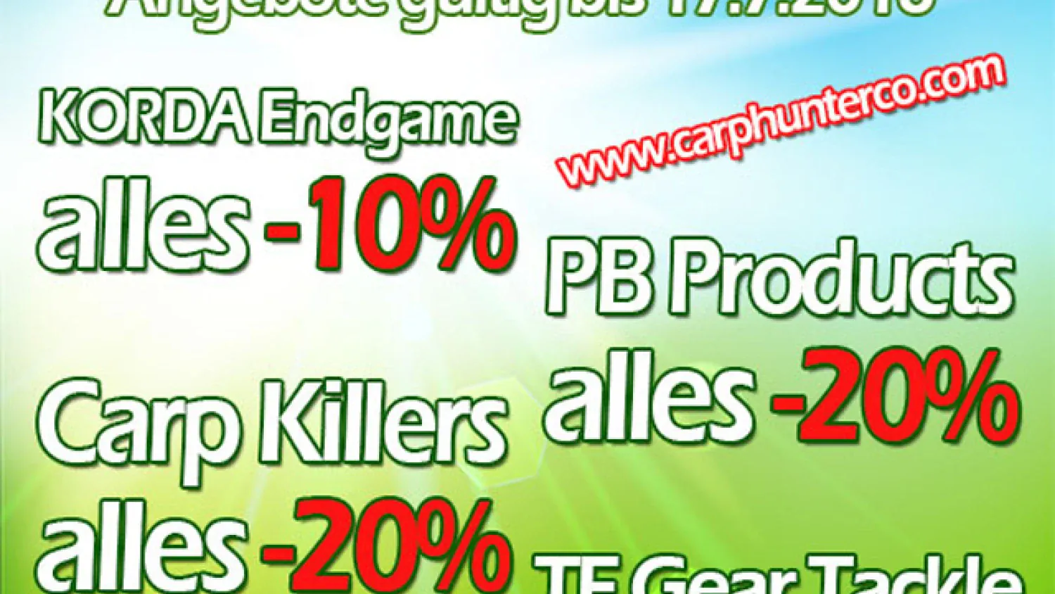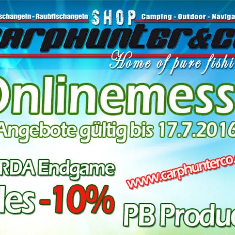 Reduziert gibt es zwischen dem 15. Und 17.07.2016 z.B. alle Carp Killers Produkte (Boilies, Liquids, Klamotten, etc.) um 20% reduziert, alles von PB Products gibt es ebenfalls um 20% reduziert und das gesamte Endtackle von Korda um 10%!