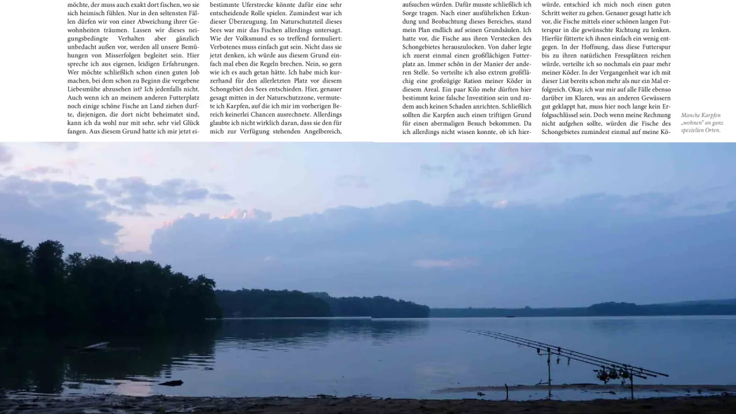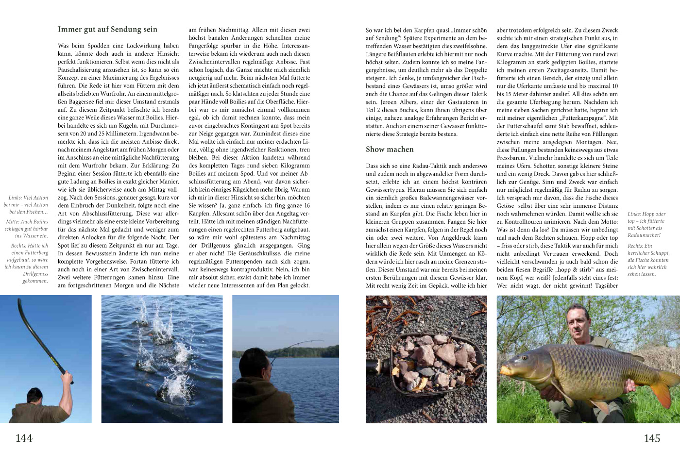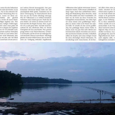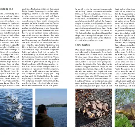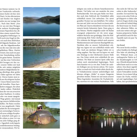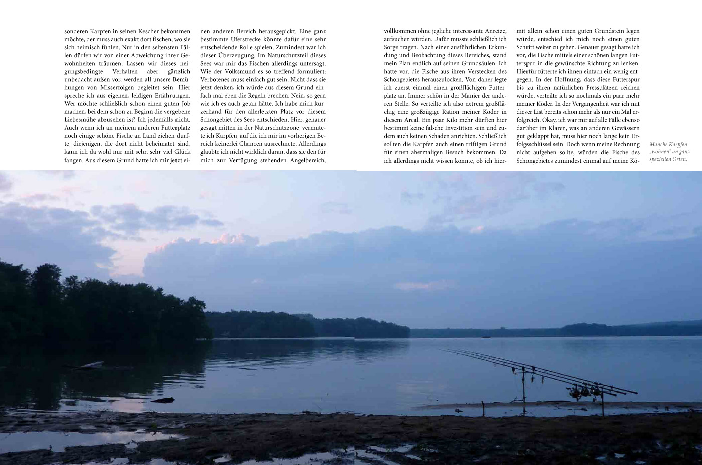 Im Taktik Kapitel geht es aber bestimmt nicht nur darum, anders zu füttern als die Konkurrenz, es beschäftigt sich viel mehr damit, seine Vorgehensweise an die gegebene Situation anzupassen. In Leseprobe 6 wird z.B. eine Taktik beschrieben, mit der es möglich wird Karpfen aus ihren Schutzzonen wie Schongebieten oder Holding Areas zu locken.