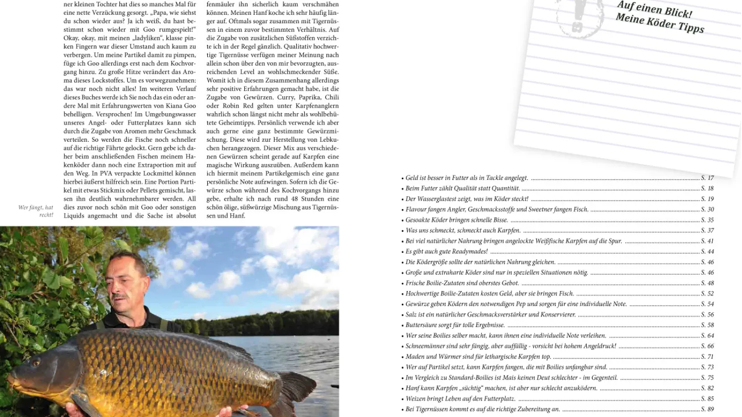 Jedes Hauptkapitel wird doppelseitig eröffnet, eine Einführung begleitet den Leser ins Thema. Köder sind Thomas' Spezialgebiet: Ein riesiger Erfahrungsschatz und breiter Wissensfundus wird im ersten WATERCRAFT-Buch dem Leser zugänglich gemacht. Egal ob Boilies für verschiedenen Situationen, Köder-Zutaten, Köder Herstellung oder Partikel und Lebendköder: Thomas hat alles, worüber er schreibt, selbst probiert und auch ausgiebig getestet!
